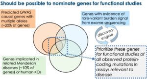 I think the tipping point for the allelic series model will be the availability of large-scale exome sequencing data in case-control cohorts. Very few sufficiently powered studies have been conducted to date. Population genetics theory predicts that at least 25,000 cases (and likely >100,000 cases) and an equal or greater number of controls are required for well-powered rare-variant association studies (here). Indeed, as such studies are published (e.g., type 2 diabetes [T2D] Nature paper here) or presented (e.g., schizophrenia ASHG plenary presentation here), genes with an allelic series are starting to be identified. If these studies find a large number of protein-coding mutations associated with traits of interest, then the bottleneck will quickly become functional interrogation (see next section).