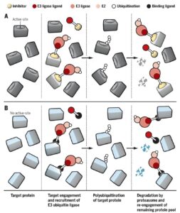 - • Protein-degradation technology. Craig Crews published a review in Science describing an approach which he calls “event-base pharmacology” (here, see figure below). I am intrigued by proteolysis-targeting chimera (PROTAC) technology, as it has the potential (underscore potential!) to become rapidly recursive (i.e., programmable). Take a look at the review and let your imagination drift towards a world where (a) every intracellular target is tagged by a small molecule, (b) each of the >700 E3 ligases is tagged by a small molecule ligand, and (c) pairs of each can be linked together and introduced quickly into humans for proof-of-concept studies. Hmmmm….