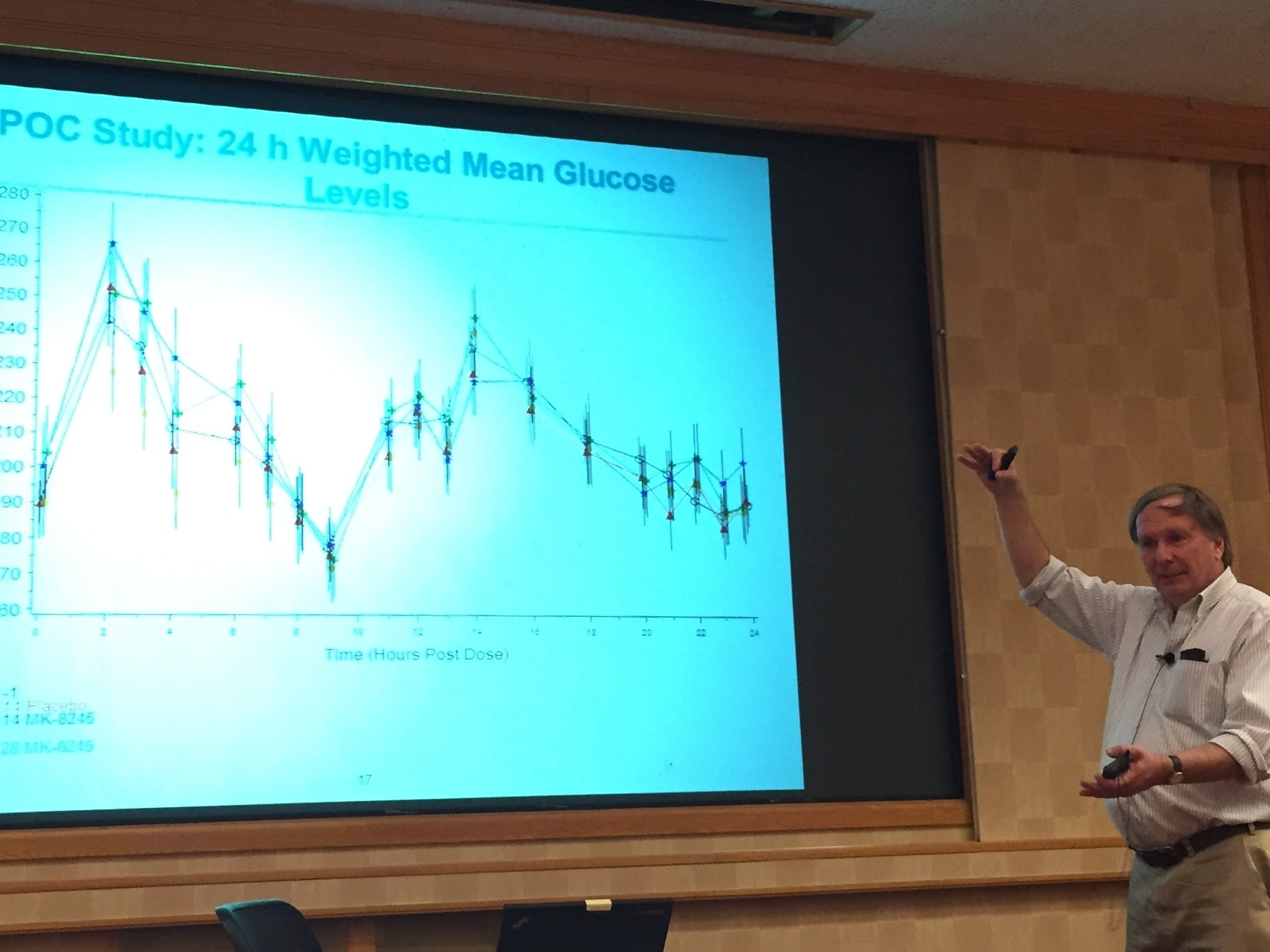 The ultimate test of a therapeutic hypothesis is to take a molecule into humans, and Gene Marcantonio described how this is done in an early proof-of-concept (POC) study: “Using the SCD-1 program as an example for developing a POC strategy”. Gene highlighted the practical aspects of getting a molecule into humans, and how important it is to work closely with colleagues in preclinical development (e.g., safety, pharmacokinetics and drug metabolism, formulations). He also explained the importance of clinical readouts such 24-hour weighted mean glucose levels (see image below).