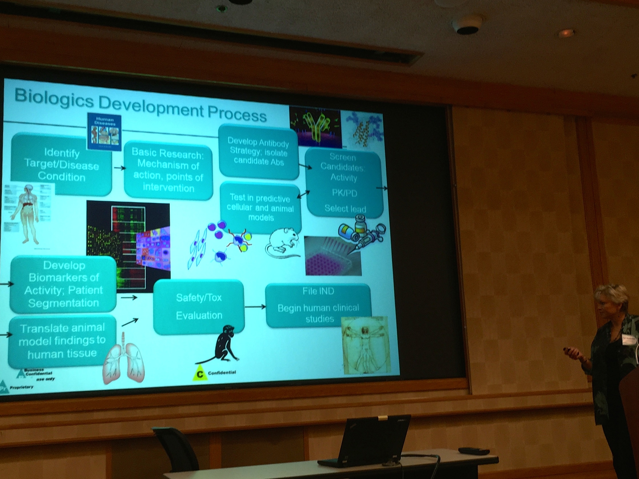 Traveling all the way from Palo Alto, CA, Terri McClanahan delivered a talk “Harnessing Translational Approaches to Power Biologics Development: Focus on Immuno-Oncology”. As I have commented elsewhere (see here), the field of immunotherapy is revolutionizing cancer treatment. Terri’s presentation reminded everyone that Merck is at the forefront of discovery research and clinical implementation in this exciting area of human biology. She also discussed the steps to develop a new biologic, as shown in the image below.