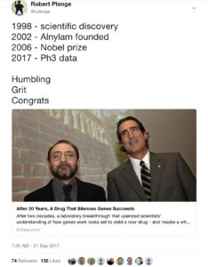 Last week Alnylam reported positive news on Phase 3 outcomes for their RNA interference (RNAi) therapy to treat patients with a rare genetic cause of amyloidosis with polyneuropathy (see here). I tweeted the following: