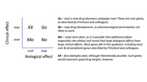 The figure below is a simple attempt to put genes into one of four quadrants based on clinical and biological / functional effects of the disease-associated variants. Based on the model of Pritchard and colleagues, a small number of core genes would fall into the “Go” quadrant. (I use “go”, as the term signals an aggressive approach to drug discovery is warranted.) Most genes today, however, fall into the “Mo” quadrant, including both core and peripheral genes. (“Mo” is for more information is needed…yes, I am trying to be clever.) Over time, as new genetic and biological information is gathered, core genes (the wheat) will be separated from other genes (the chaff).