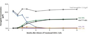 The transplanted, genetically modified CD34+ stem cells began to produce normal red blood cells after about 3 months (see Figure 1, below). The patient was discharged from the hospital on day 50. The last transfusion was 88 days after transplant. More than 15 months after transplantation, no sickle cell disease–related clinical events or hospitalization had occurred.