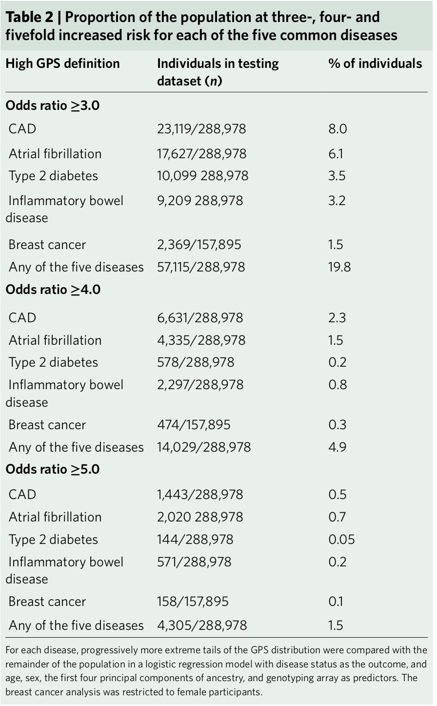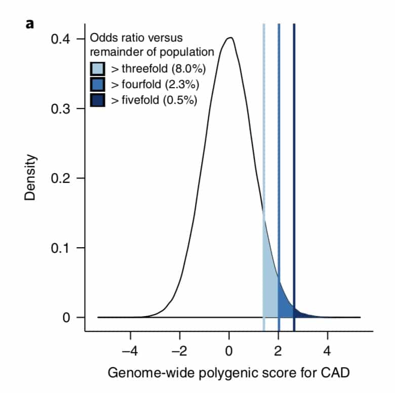 The premise of the paper is that a genome-wide polygenic score (GPS) – a composite genetic test that includes thousands and sometimes millions of genetic variants – can identify a small number of individuals from the general population that have an elevated risk. The study applies polygenic risk scores to five common diseases but spends most attention to coronary artery disease (CAD). For each disease, the increase in risk is approximately 3- to 5-fold higher among individuals at the extreme of the polygenic tail compared to those in the general population – see Figure 2a (and below) for CAD, where ~8% of the general population is at a 3-fold increase in risk based on a polygenic risk score.