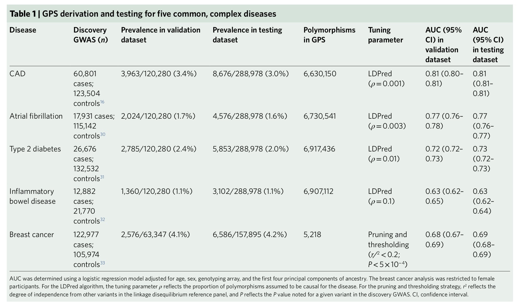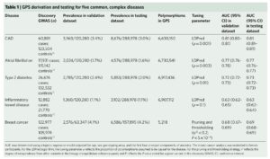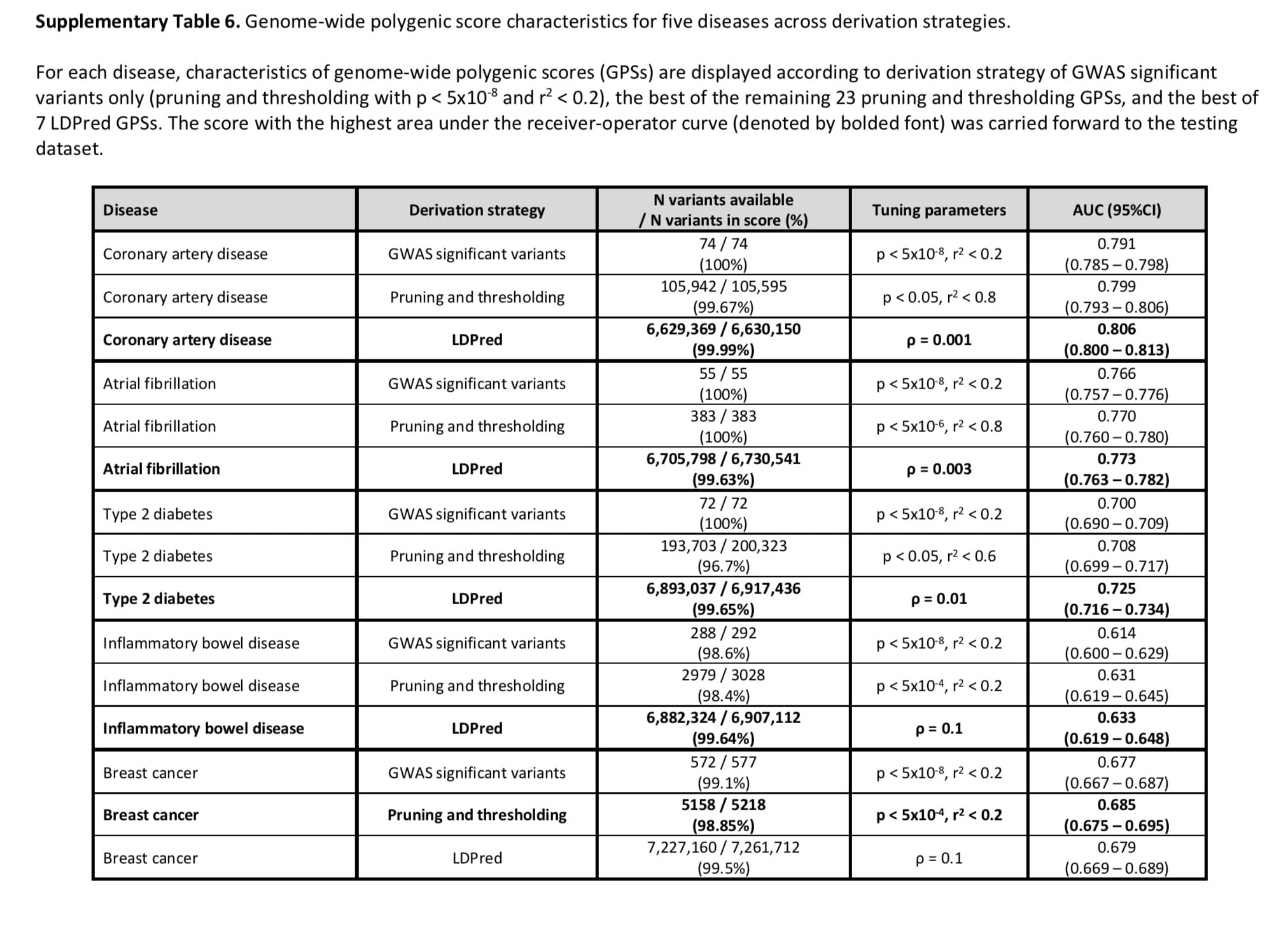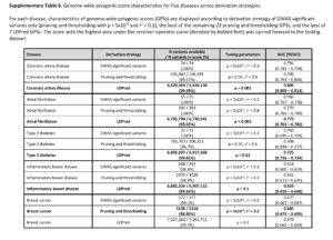 The second criticism is that adding additional variants to the risk score beyond those that are established, genome-wide significance variants does not add much to risk prediction. While this may be a valid criticism, the point is that GPS do add 1- to 2-points on the AUC for each of the 5 diseases tested. See Supplementary Table 6, below, as an example; compare AUC from top line vs AUC in bold for each disease. Given the option, I would prefer to have a model that has higher predictive value. Wouldn’t you? Sure, the increase is modest, but it is an increase in predictive value nonetheless. For more on this debate, see @cecilejanssens tweetorial here.